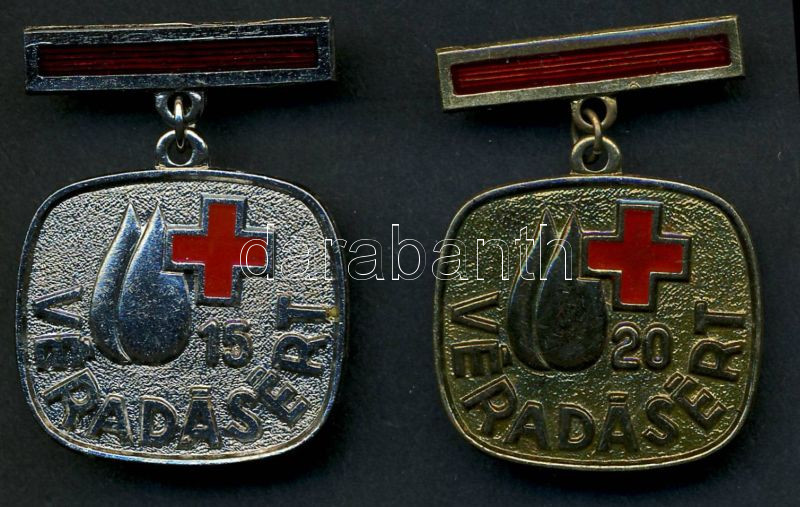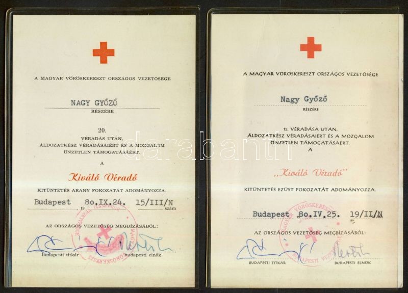 1980. 15. és 20. véradás után járó "Kiváló véradó" kitüntetés ezüst és arany fokozata eredeti dísztokban, adományozói okirattal. T:1