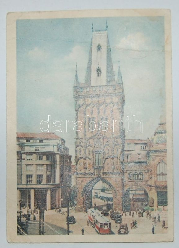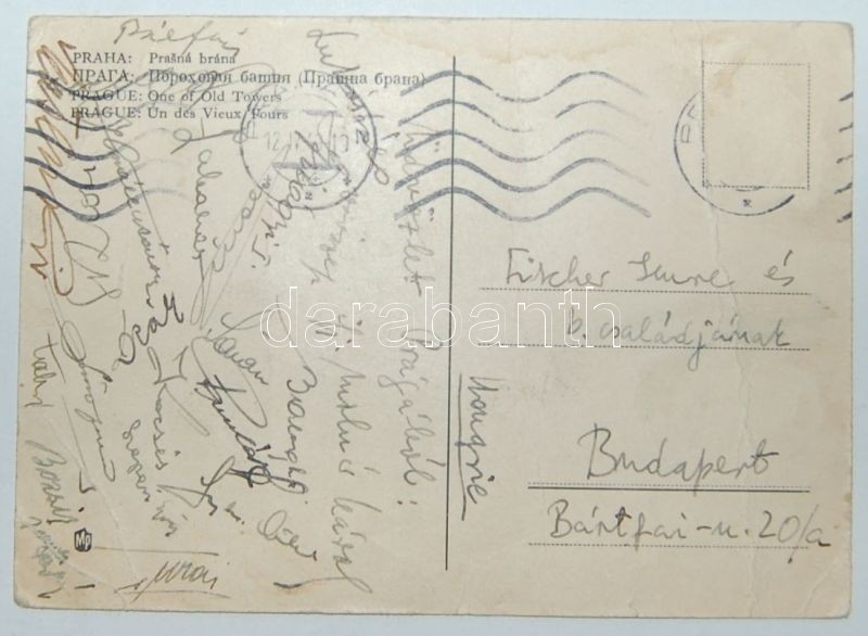Description: 1949 A magyar válogatott összes tagja (Puskás, Szusza, Bozsik, Kocsis, Turai...) valamint Sebes Gusztáv és Szepesi György által aláírt képeslap Prágából a Magyarország-Csehszlovákia mérkőzésről hazaküldve. Kissé gyűrött / Postcard sent from Prague signed by the memers of the Hungarian football-team (later Golden team) incl. Puskas, Bozsik, Kocsis...