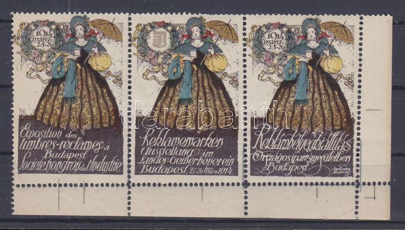 1914 Reklámbélyeg kiállítás háromnyelvű levélzáró sor hármascsík