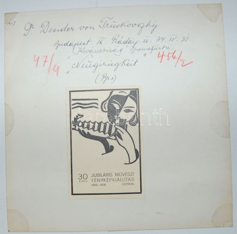 1936 Truskovszky Dezső: Kíváncsiság. A soproni jubiláris művészi fényképkiállítás anyagából, a kiállítás címkéjével 23x23 cm