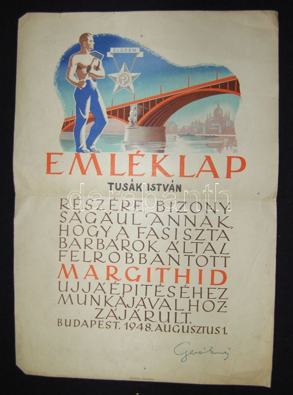 1948 aug. 1. Margit-híd újjáépítéséért kapott emléklap