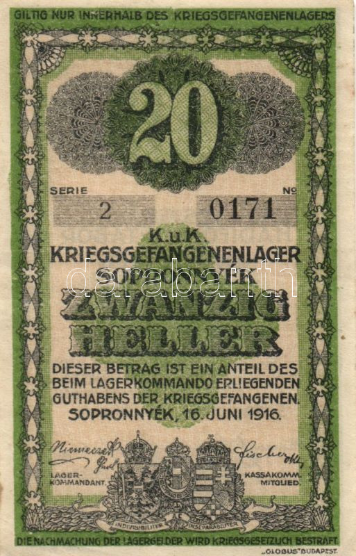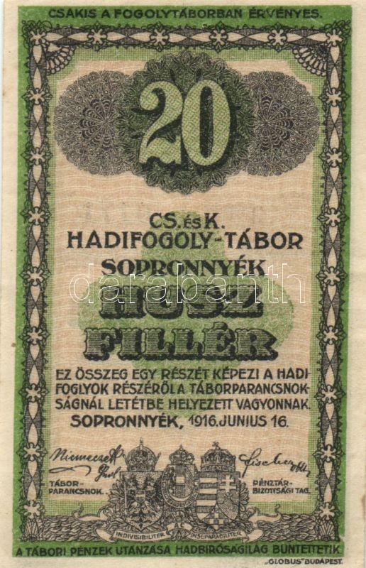 https://www.darabanth.com/en/145-Online-auction/145.0/Numismatics/Hungarian-and-foreign-emergency-notes-and-coins-tokens~500096/Sopronnyekhadifogolytabor-1916-junius-16-20f-TI-apro-kapocs-lyuk~II427689