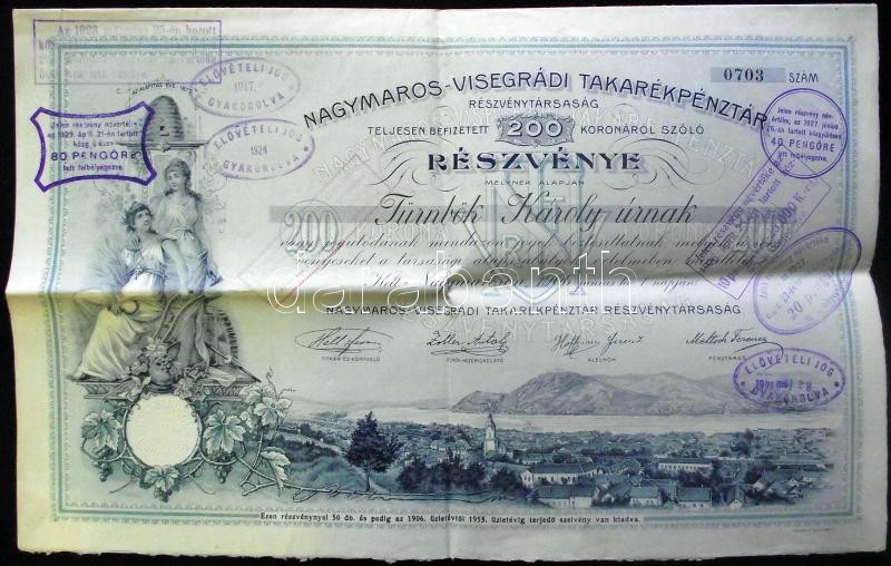 1906 A Nagymaros-Visegrádi Takarékpénztár Rt. részvénye 200K-ról szelv...