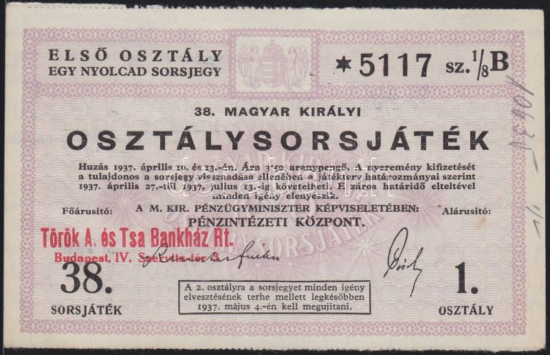 1937. "38. Magyar Királyi Osztálysorsjáték" első osztály egy nyolcad sorsjegye T:II-
