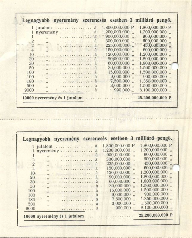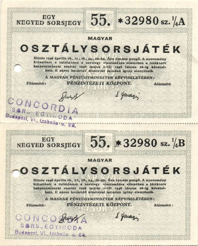 1946. "55. Magyar Osztálysorsjáték" egy negyed "A" és "B" sorsjegye párban, lyukasztással érvénytelenítve T:I