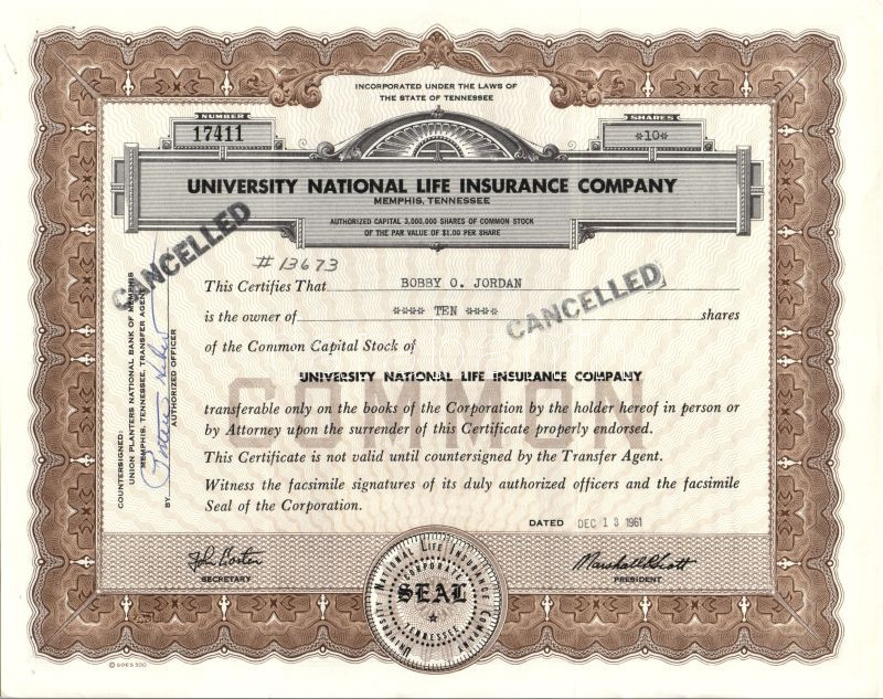USA / Memphis 1961. University National Life Insurance Company biztosítási részvénye T:II