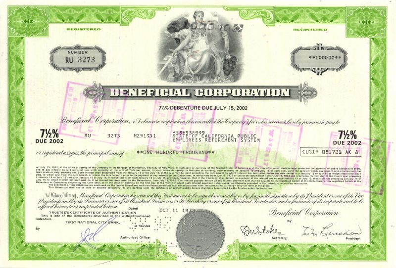 USA / New Jersey 1972. Beneficial Corporation pénzügyi társaság részvénye T:I-