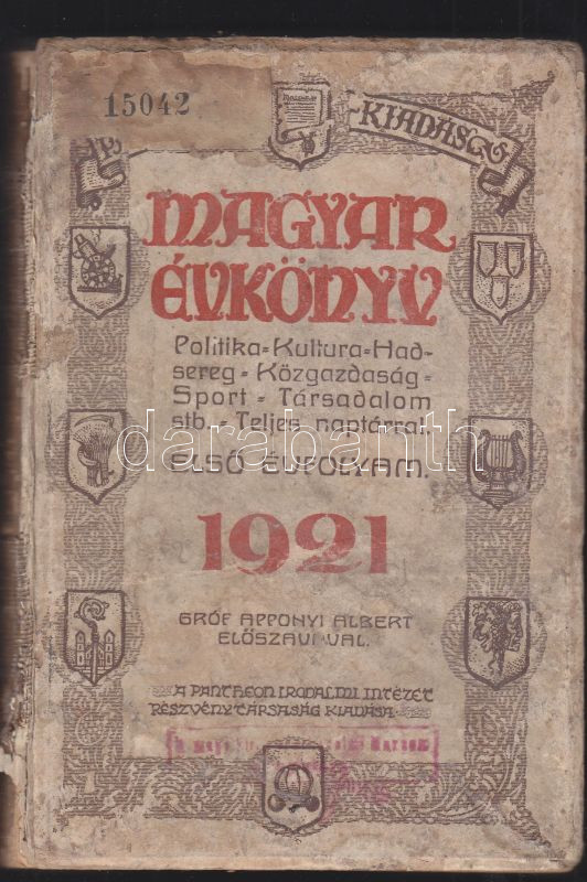 https://www.darabanth.com/en/145-Online-auction/145.0/Other-collectibles/Books-Other-rarities~221/1921-Magyar-Evkonyv-teljes-naptarral-elso-evfolyam-grof-Apponyi-Albert-eloszavaval-Panthe~II434848