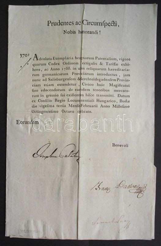 1808 Helytartótanácsi levél kereskedelmi rendelet kihirdetéséről Józse... https://www.darabanth.com/en/145-Online-auction/145.0/Other-collectibles/Historical-documents-manuscripts~202/1808-Helytartotanacsi-level-kereskedelmi-rendelet-kihirdeteserol-Jozsef-nador-es-Darvas-Fer~II409482
