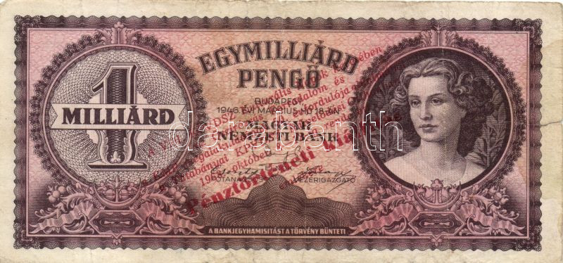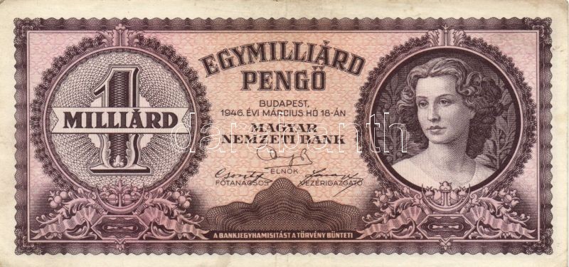 1946. 1.000.000.000P (2x) eltérő színárnyalattal, egyiken "Pénztörténe...