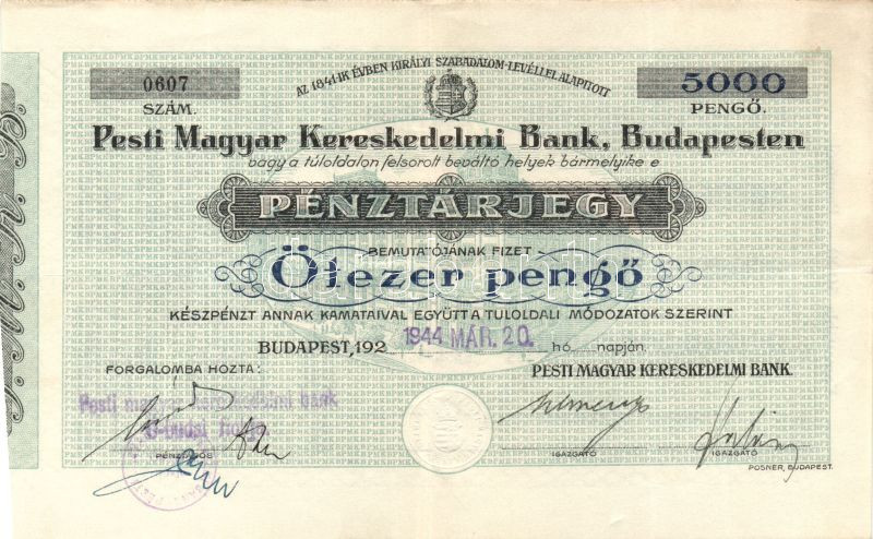 1944. A Pesti Magyar Kereskedelmi Bank pénztárjegye 5000P-ről T:II