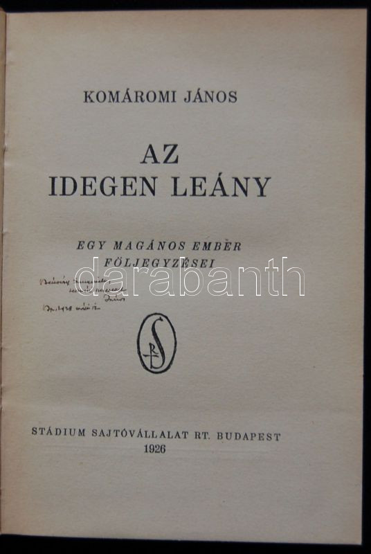 https://www.darabanth.com/en/146-Online-auction/146.0/Other-collectibles/Books-Other-rarities~247/Komaromi-Janos-Az-idegen-leany-Bp-Dick-Mano-Dedikalt-elso-kiadas-Aranyozott-sorozati-vas~II427285