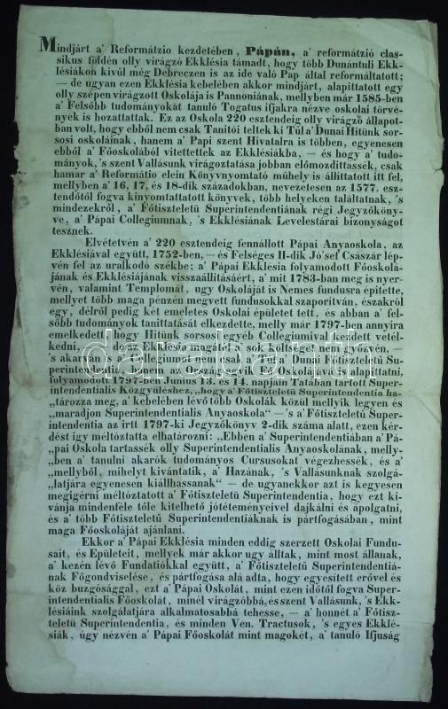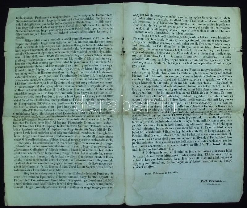 1839 Tóth Ferentz: A pápai eklézsia rövid története. 4 nyomtatott oldal 23x36 cm (kissé foltos)