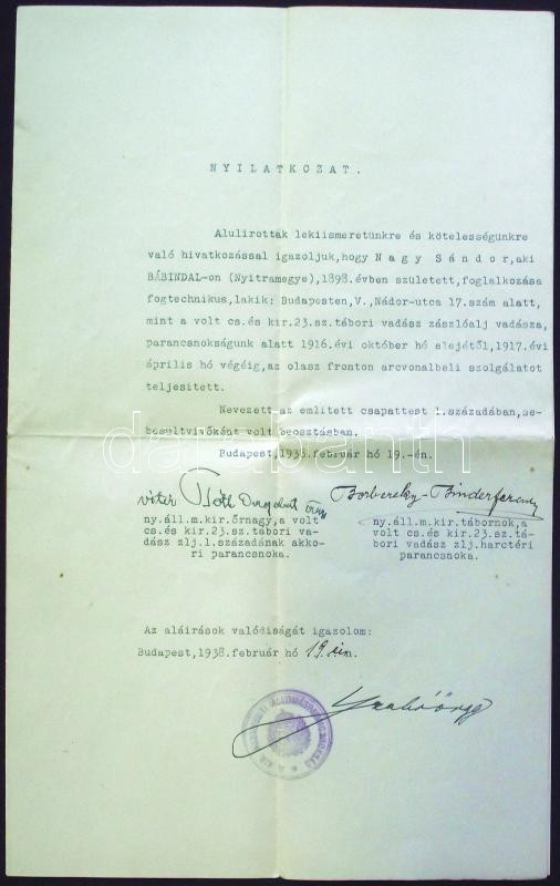 1938. Nyilatkozat olasz fronton teljesített szolgálatról, Borbereky-Bi...