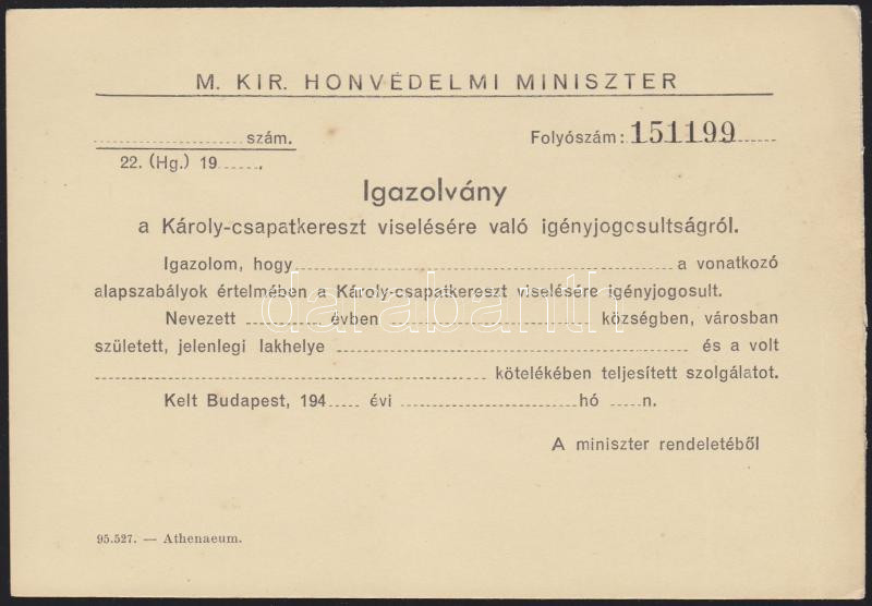 Károly-csapatkereszt viselésére jogosító igazolvány, kitöltetlen-hátul...