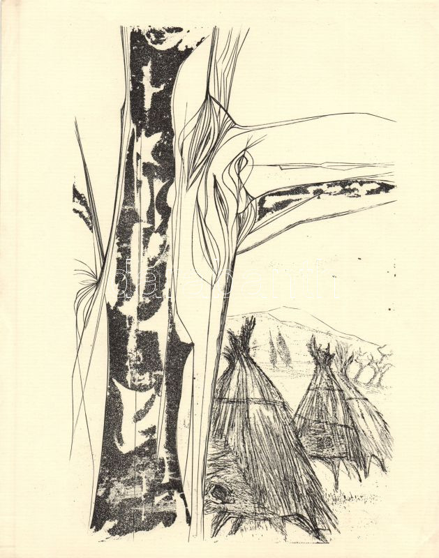 Lóránt János? Kunyhók, linó-papír, jelzés nélkül, 18x26 cm