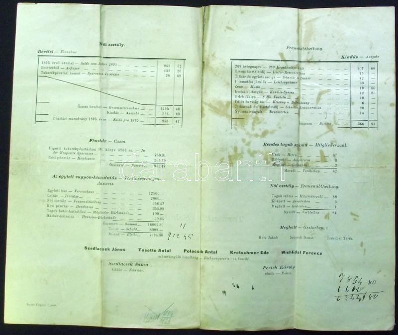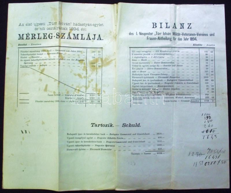 1894. "az első ujpesti Türr István hadastyán-egylet és női osztályának 1894. évi Mérleg-Számlája" német és magyar nyelven