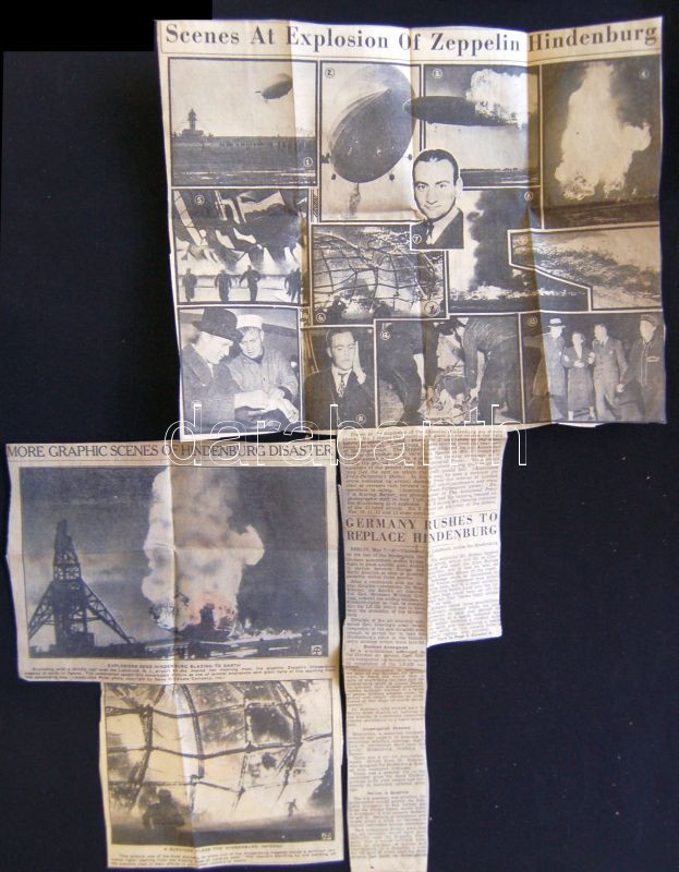 1937 A Hindenburg léghajó katasztrófájáról tudósító amerikai újságkivágás képekkel. A katasztrófa a Zeppelin korszak végét jelentette / 1937 Cut-out from an US magazine sreening the catastrophy of Hindenburg Zeppelin wich put an end to the Zeppelin-era