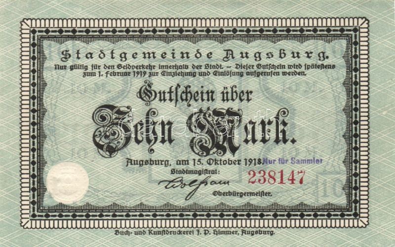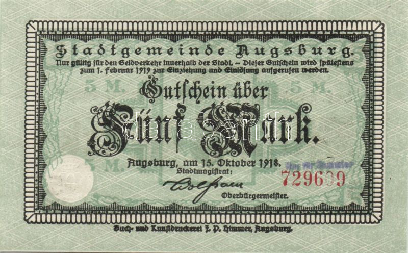 Német Birodalom/Császárság/Augsburg 1918.10.15. 5M, 10M hivatalos érvé...