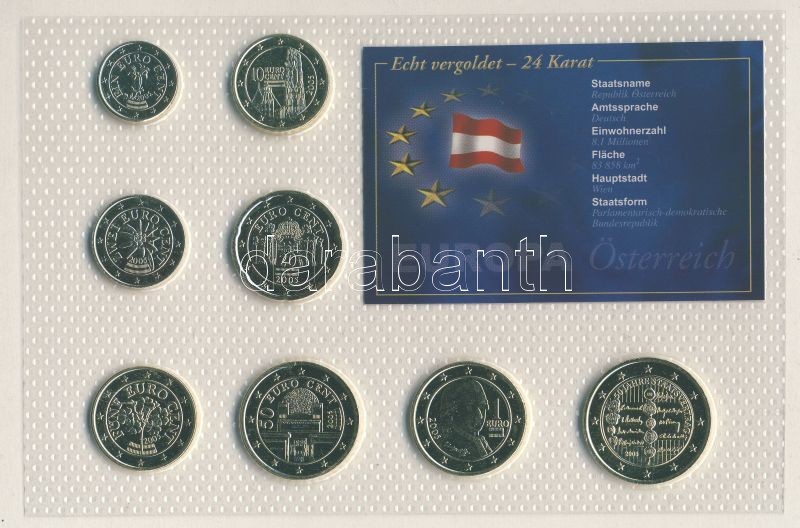 Ausztria 2005. 1c-2€ 8 különféle db szettben, aranyozott (24K) k... https://www.darabanth.com/en/148-Online-auction/148.0/Numismatics/Foreign-coins~500121/Ausztria-2005-1c-2238364-8-kulonfele-db-szettben-aranyozott-24K-kiadas-tanusitvannyal-T~II446166