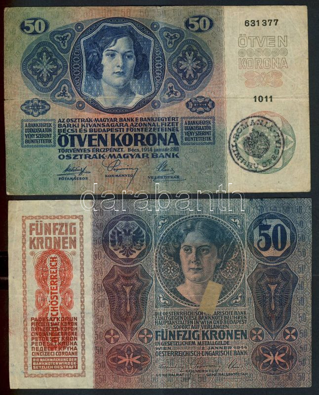 https://www.darabanth.com/en/148-Online-auction/148.0/Numismatics/Hungarian-Banknotes~500116/1914-50K-2x-fuggoleges-Deutschosterreich-felulbelyegzessel-es-roman-korbelyegzovel-T~II429725