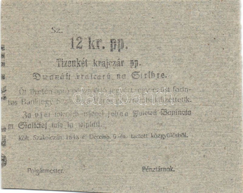 https://www.darabanth.com/en/148-Online-auction/148.0/Numismatics/Hungarian-and-foreign-emergency-notes-and-coins-tokens~500115/1848-12kr-pp-Szakolcza-penzpotlo-jegy-vizjellel-sorszam-es-alairasok-nelkul-TII~II444238