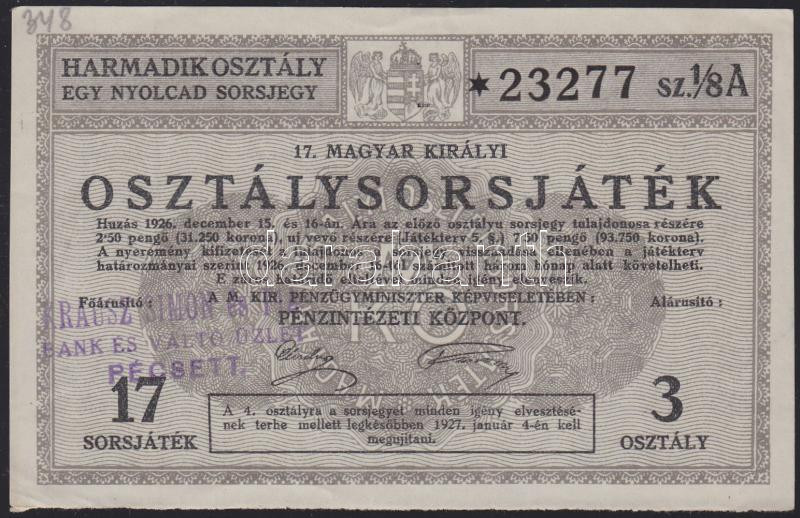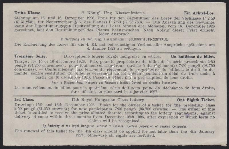 1926. "17. Magyar Királyi Osztálysorsjáték" ötödik osztály egy nyolcad...