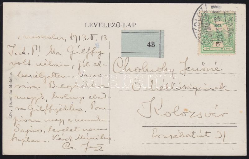 1913 Cholnoky Jenő földrajztudós saját kézzel írt képeslapja feleségének Miskolcról