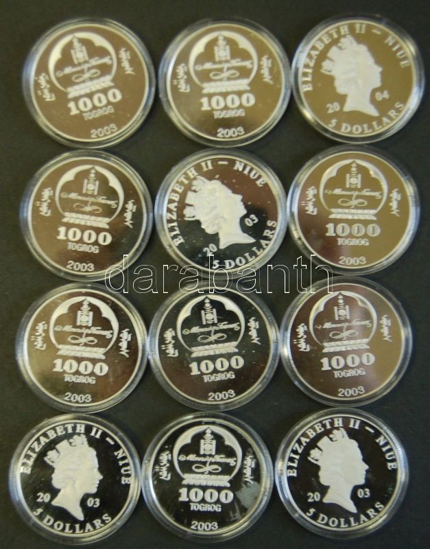 Mongólia 2003. 1000T Ag "Ázsia történelme-Taj Mahal" + 1000T Ag "Ázsia történelme-Marco-Polo" + 1000T Ag "Ázsia történelme-Buddha" + 1000T Ag "Ázsia történelme-Dzsingisz Kán" + 1000T Ag "Ázsia történelme-Hillary" + 1000T Ag "Ázsia történelme-A kínai Nagy Fal" + 1000T Ag "Ázsia történelme-Konfuciusz" + 1000T Ag "Ázsia történelme-Transzszibériai expressz" + Niue 2003. 5$ Ag "Kék mecset" + 5$ Ag "Terrakotta harcosok" + 5$ Ag "Hammurápi törvénykönyve" + 2004. 5$ Ag "Mao Ce Tung" összesen 12db! T:PP / Mongolia commemorative coin series 2003. 1000 Togrog Ag "History of Asia" (8x) C:Proof + Niue 2003. 5$ Ag (3x) 3 different "History of Asia" + 2004. 5$ Ag "History of Asia-Maotse Tung and the Long March" C:Proof