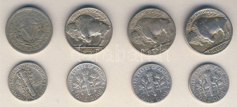 USA 1910. 5 cents Ag + 1920-36. 5 cents Ag (3x) + 1944. 1 dime Ag "Mercury" + 1949-64. 1 dime Ag "Roosevelt" (3x) T:2,2-,3 / C:XF,VF,F