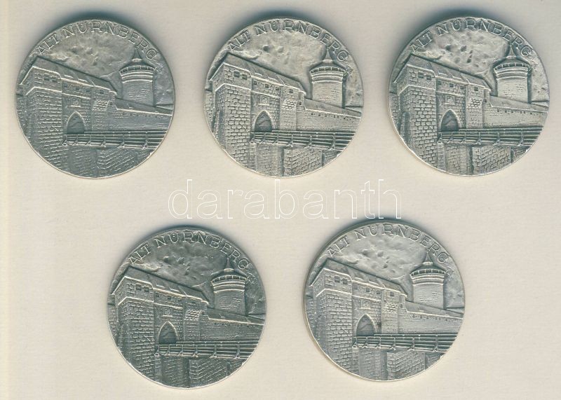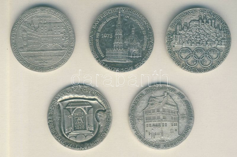 NSZK 1971-75. 5db különféle matt Ag emlékérem "Bayerische Vereinsbank, Nürnberg" (Dürer-ház, Nürnberg olimpia, Frauenkirche ...)16,88g/16,82g/15,92g/16,43g/16,22g T:1-,2 / Germany-Federal Republic 1971-75. 5 different matt Ag medallion from Nürnberg C:aUnc,XF