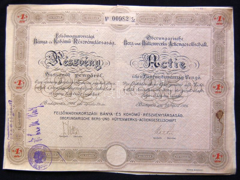 https://www.darabanth.com/en/149-Online-auction/149.0/Numismatics/Shares-Securities-and-Tickets~600098/1926-Felsomagyarorszagi-Banya-es-Kohomu-Reszvenytarsasag-reszvenye-25P-rol-nemet-~II452825