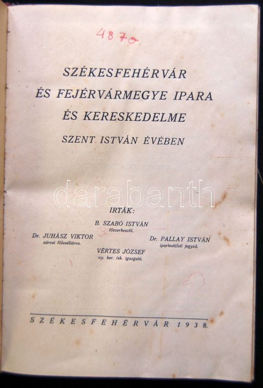 Description: Szabó István, Juhász Viktor - Pallay István - Vértes József: Székesfehérvár és Fejér vármegye ipara és kereskedelme Szent István évében. 1938. A borító erősen megviselt