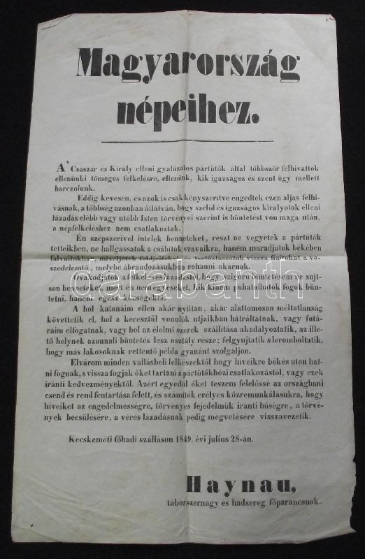 1849 Magyarország népeihez - Haynau július 28.-i hirdetménye, melyben ... https://www.darabanth.com/en/149-Online-auction/149.0/Other-collectibles/Historical-documents-manuscripts~197/1849-Magyarorszag-nepeihez--Haynau-julius-28-i-hirdetmenye-melyben-az-ellenallas-abbahagya~II453631