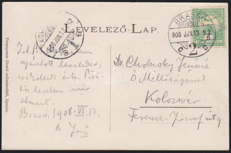 1909 Cholnoky Jenő földrajztudós saját kézzel írt képeslapja feleségének Erdélyi körútjától