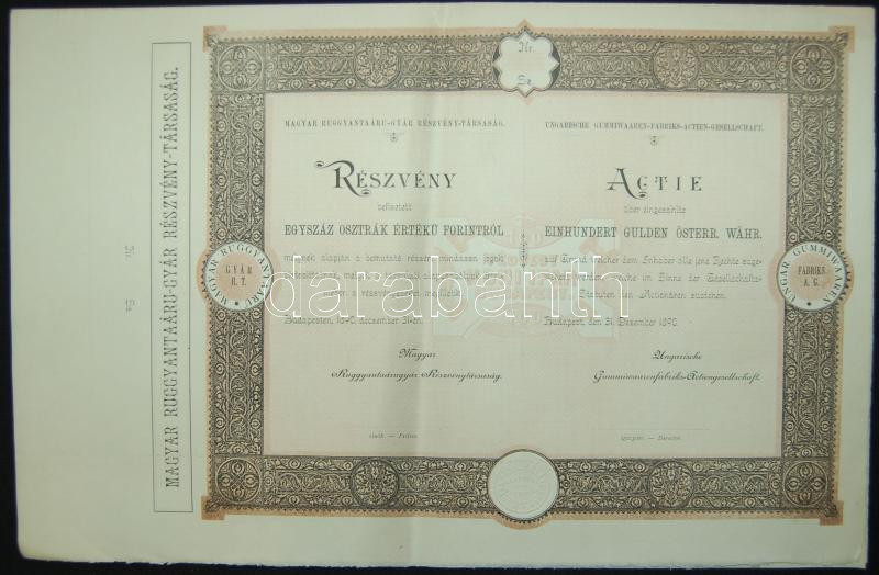 https://www.darabanth.com/en/150-Online-auction/150.0/Numismatics/Shares-Securities-and-Tickets~6/1890-Magyar-Ruggyantaaru-Gyar-Reszvenytarsasag-reszvenye-100-osztrak-erteku-Ft-rol-s~II455267