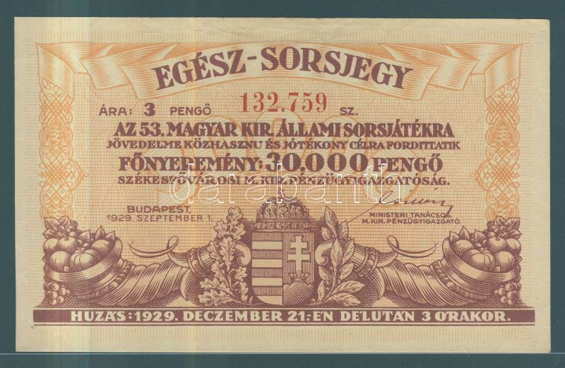 1929. Egész-sorsjegy 3P értékben az 53. Magyar Kir. Állami sorsjátékra T:II