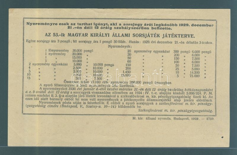 1929. Egész-sorsjegy 3P értékben az 53. Magyar Kir. Állami sorsjátékra...