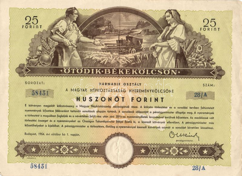 1954. "Ötödik Békekölcsön Harmadik Osztály" a Magyar Népköztársaság Nyereménykölcsöne 25Ft-ról T:II