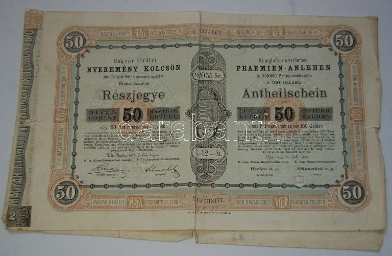 https://www.darabanth.com/en/150-Online-auction/150.0/Numismatics/Shares-Securities-and-Tickets~6/Buda-1870-Magyar-Kiralyi-Nyeremeny-Kolcson-50Ft-os-I-es-II-reszjegye-magyar-es-nemet-nyel~II455548