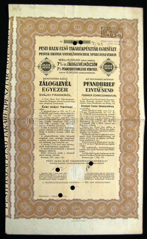 Budapest 1931. "Pesti Hazai Első Takarékpénztár-Egyesület" záloglevele 1000 svájci frankról magyar és német nyelven szárazpescéttel, felülbélyegzéssel