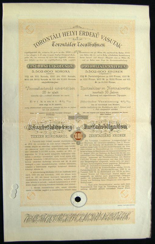 Description: Nagybecskerek 1895. "Torontáli Helyi Érdekü Vasutak" Részletkötvénye 10.000K-ról magyar és német nyelven,szép állapotban /