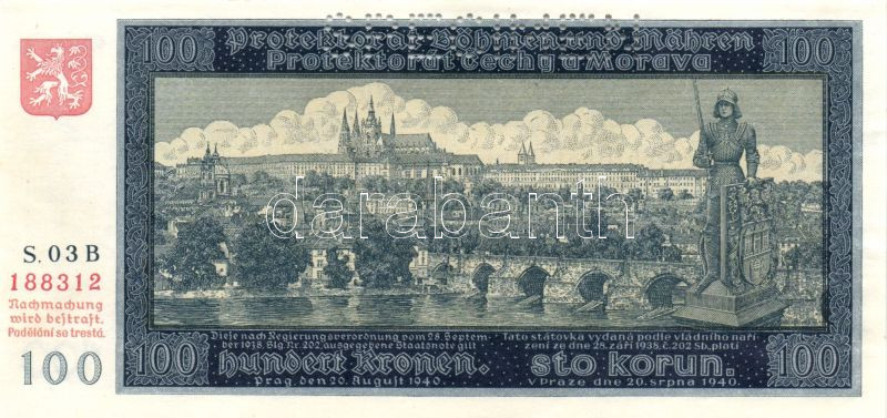 Német 3. Birodalom/Cseh-Morva Protektorátus/német megszállás 1940. 100... https://www.darabanth.com/en/151-Online-auction/151.0/Numismatics/Foreign-banknotes~500155/Nemet-3-BirodalomCseh-Morva-Protektoratusnemet-megszallas-1940-100K-SPECIMEN-perforacio~II461000