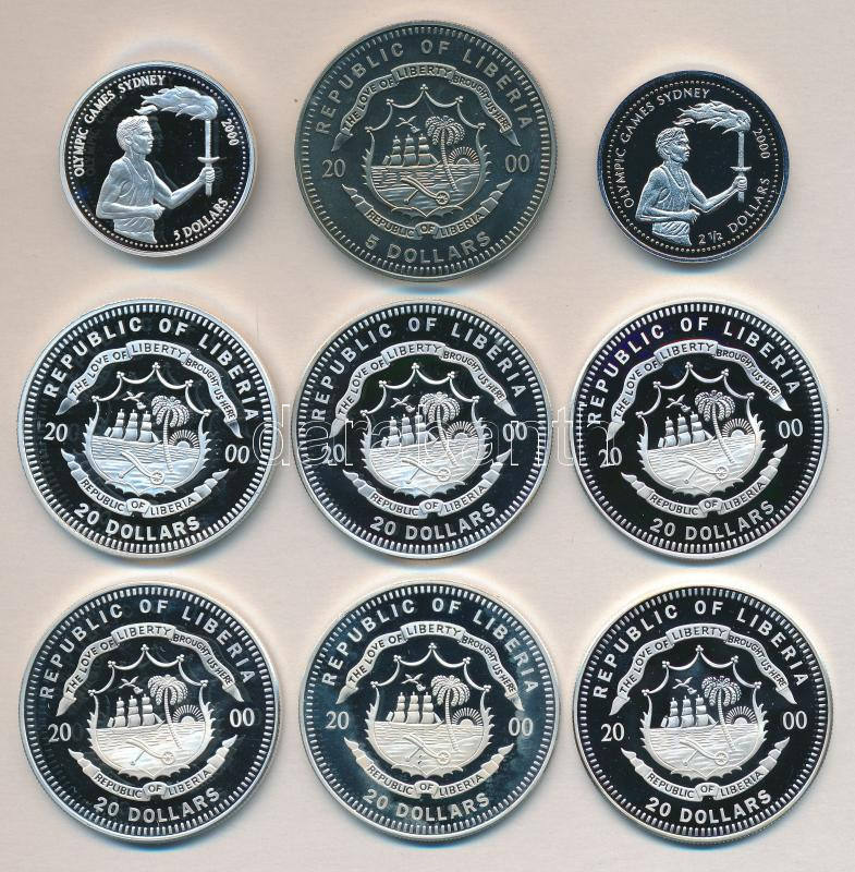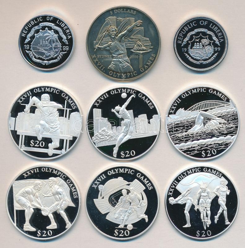 Libéria 1999. 2 1/2$ CuNi "Olimpia Sidney" + 5$ Ag "Olimpia Sidney" + 2000. 5$ CuNi "Olimpia" + 20$ Ag (6x) "XXVII. Nyári Olimpia / Sidney-labdarúgás,gátfutás,röplabda,triatlon,kosárlabda,úszás" T:PP,BU