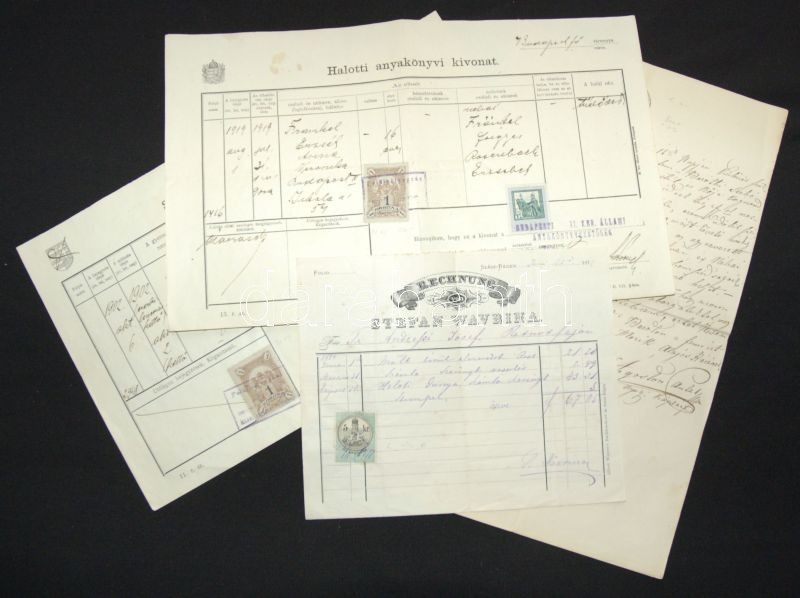 9 db okmánybélyeg és 1 szignetta (5 db okmányon) + 5 db Budapesti városi bélyeg