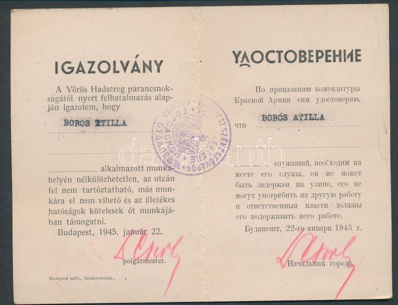 1945 szovjet-magyar nmalenkij robottól megóvó igazolvány + cca 1916 Fé...