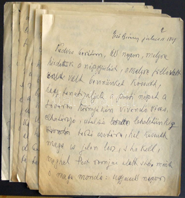Description: Hatvany Lajos (1880-1961) író, kritikus, irodalomtörténész autográf kézirata: Petőfi Sándor Arany Jánoshoz írt utolsó levelének sajátkezű átirata, melyben a megkeseredett, mellőzött Petőfi panaszkodik barátjának + Hatvany feljegyzései. 6 kézírásos lap