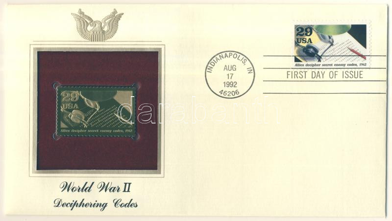 USA/Indianapolis 1992. "II.Világháború /Kódfejtő- aranyfóliás(22kt) bé... https://www.darabanth.com/en/152-Online-auction/152.0/Numismatics/Foreign-precious-commemorative-medals-plaques-badges~700016/USAIndianapolis-1992-IIVilaghaboru-Kodfejto-aranyfolias22kt-belyeg-replika-FDC-bori~II472429