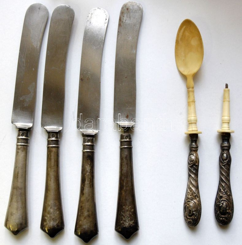 4db ezüst (Ag) nyelű vajazókés (25cm) és 2db csont kanál fém nyéllel (az egyik feje hiányzik)