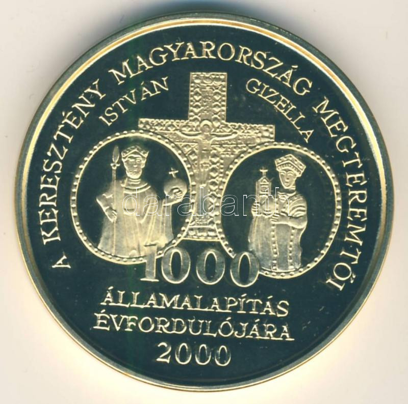 Description: 2000. "T.G. Virágdekor Szakképző Intézet Kecel / A Keresztény Magyarország megteremtői-István és Gizella" aranyozott fém emlékérem (d=42mm) dísztokban T:PP